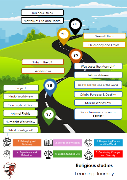 The Religious Studies curriculum is designed taking into account the Ofsted research review series which identified the promotion of the three lenses of the subject: Theology; Philosophy and Ethics and Social Sciences through the teaching of a wide range of religious and non-religious worldviews. Additionally, consideration has been given to teaching students subject-specific vocabulary before they encounter it in content in longer length text
