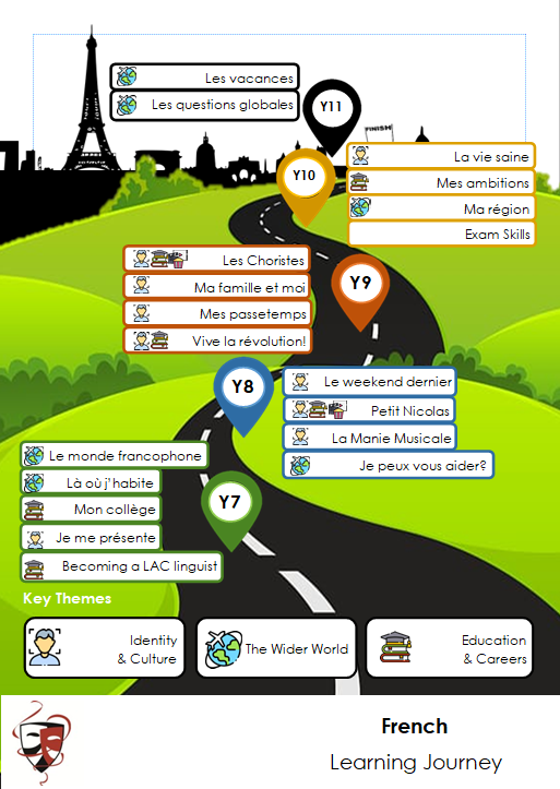 Our focus on sentence builders, comprehensible input and the importance of listening is influenced by the work of Gianfranco Conti and we are developing our phonics teaching in line with the new GCSE.  Our curriculum spirals 6 content strands: My Personal World, Lifestyle and Wellbeing, My Neighbourhood, Media and Technology, School and Future plans and Travel & Tourism.