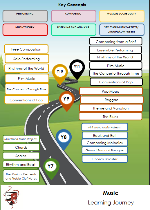 Our Music curriculum is also designed around the key skills of performance, composition, aural perception and theory. Throughout our curriculum these key concepts are introduced in the first few topics in Year 7 and then throughout the rest of the year, in subsequent years and beyond to GCSE and A-level, they are embedded and developed to achieve increasing confidence, maturity and sophistication.