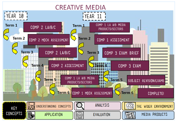 The curriculum is designed to develop students’ understanding of practical processes, skills and techniques – from broadcast media to increasingly interactive products and platforms. Throughout the course, students will explore media sectors whilst developing a range of skills, producing digital media products in response to industry style briefs, gaining an insight to professional roles and responsibilities. The curriculum develops the ability for students to deconstruct the digital world we live in today and to critically analyse underlying messages encoded by media producers and decoded by audiences. Students will apply and build on subject knowledge and analytical skills through a range of chunked assignments, before they sit internal and external controlled assessments across Year 10 and 11.